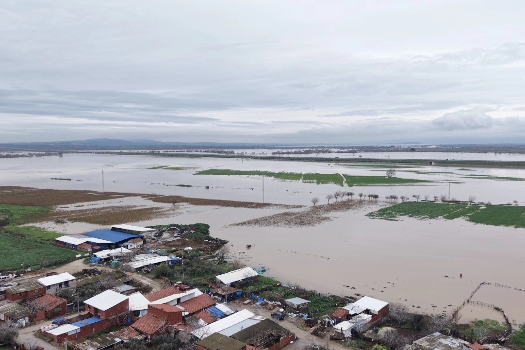 Dron ile kaydedilen görüntülerde, tarım arazilerinin büyük bölümünün suyla kaplandığı dikkat çekerken, taşkının boyutu havadan daha net şekilde ortaya kondu.