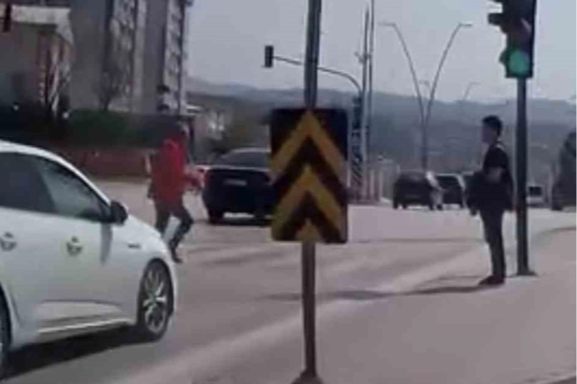 Bursa’nın Nilüfer ilçesinde trafik ışıklarının araçlara yeşil yandığı sırada karşıya geçmek isteyen bir yaya, akan trafiğe aldırış etmeden yola çıktı. O esnada seyir halinde olan bir otomobil, aniden önüne çıkan yayaya çarpmamak için manevra yaptı.